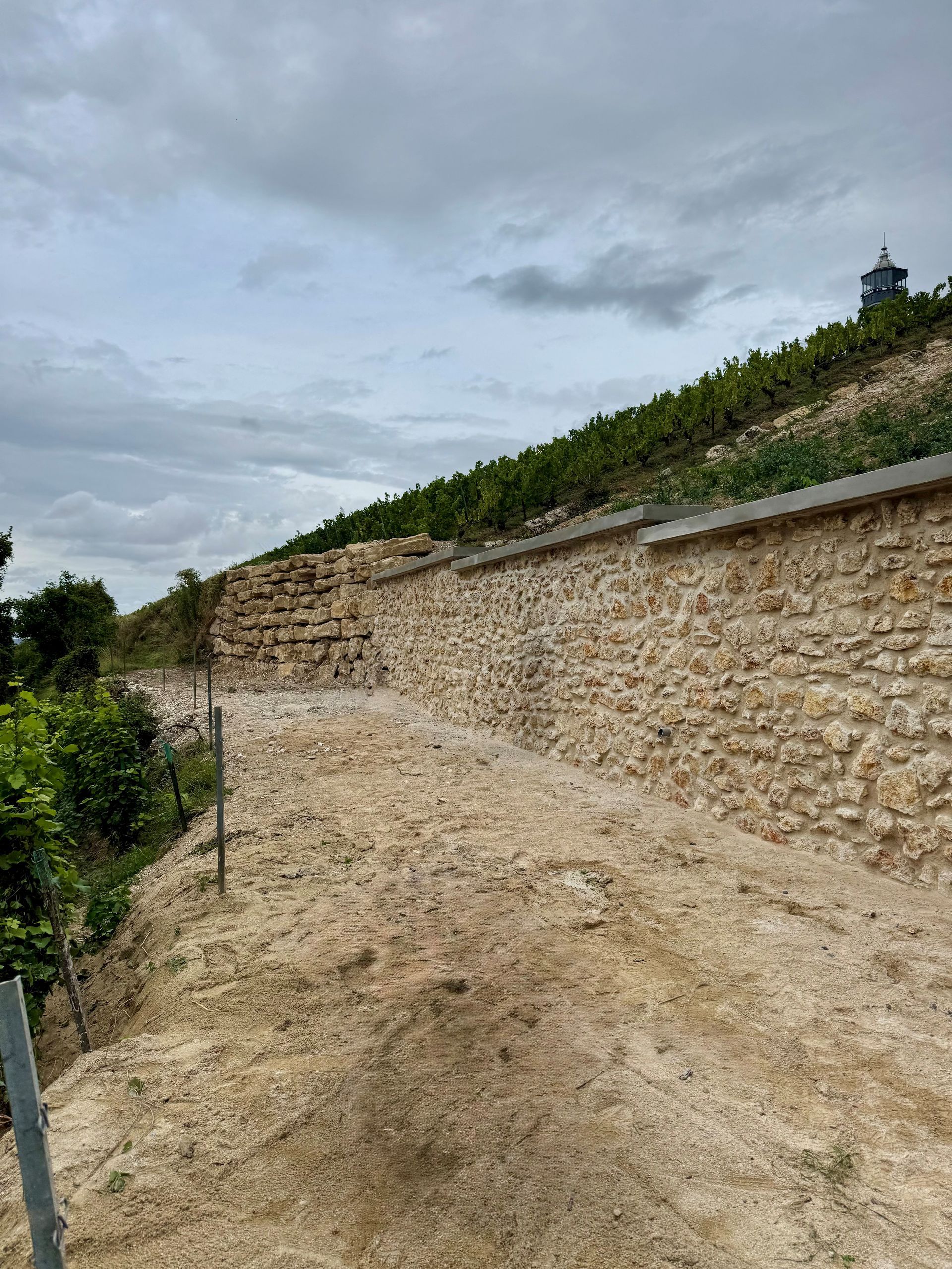 Réalisation d’un mur de soutènement en agglos à bancher, conçu pour s’adapter à un terrain en pente grâce à une semelle en T renversé.