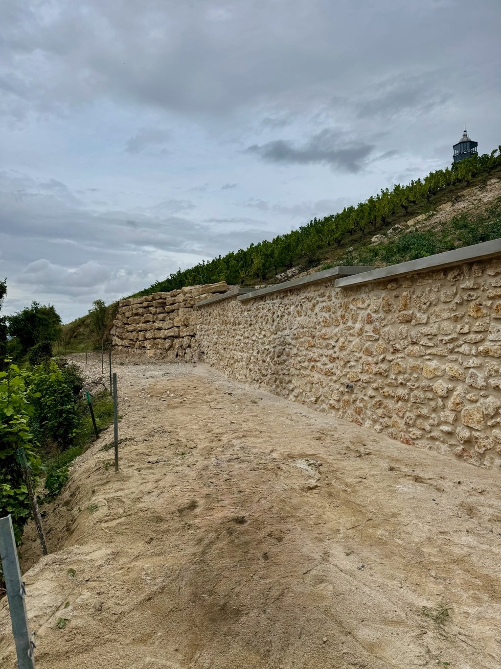 Cette parcelle du Champagne Pommery présentait une pente importante et une exposition variable aux intempéries. La création d’un mur de soutènement ici permet :